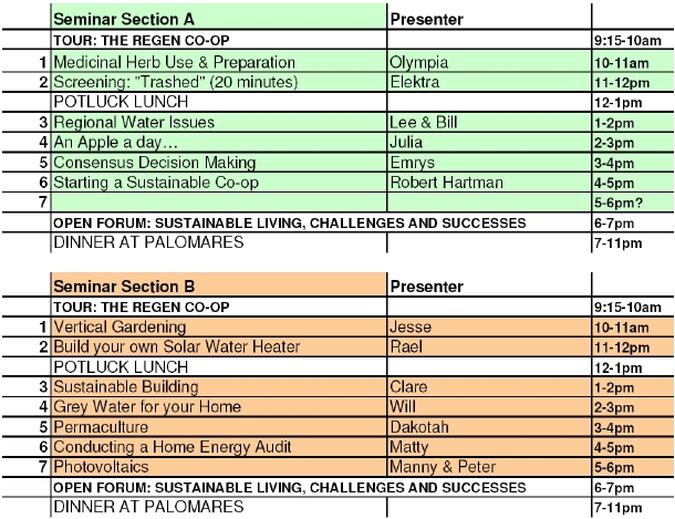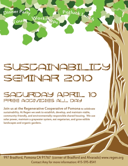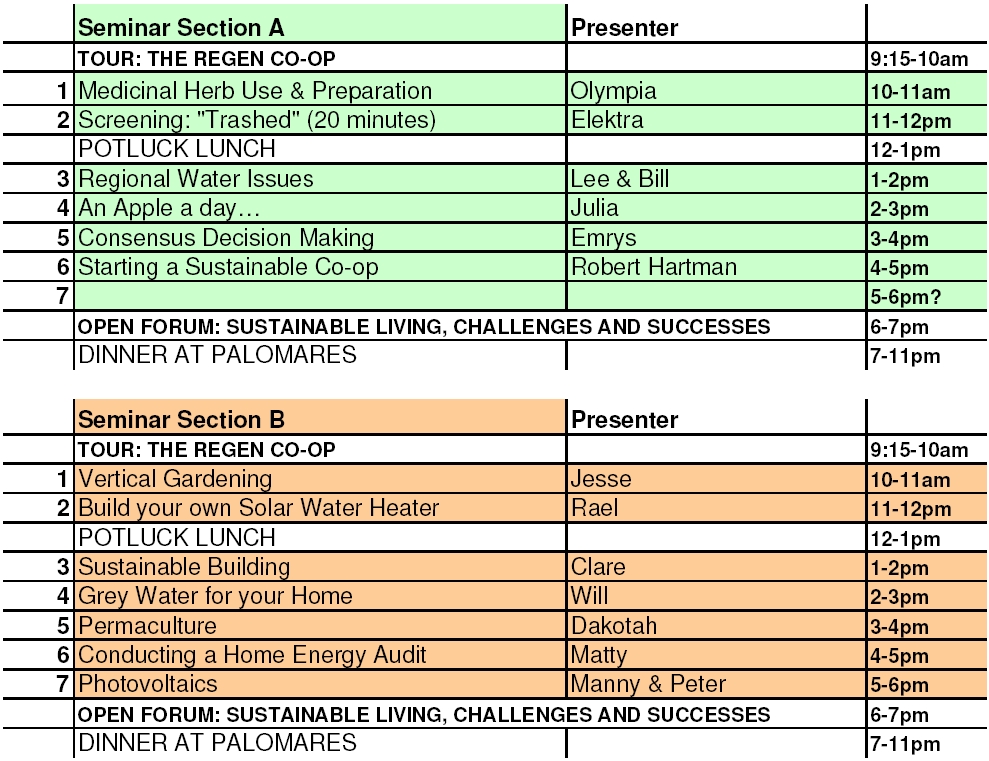 Join us for our annual Sustainability Seminar on Saturday, April 10th, 2010! Vertical gardening, medicinal herb use, building your own solar hot-water heater, sustainable home agriculture, solar power and home energy efficiency, regional water issues, consensus decision making, and starting your own coop will all be topics presented. A discussion forum will take place in the evening. A potluck lunch at noon, and dinner and a closing party will happen after the evening forum. See you soon!!!