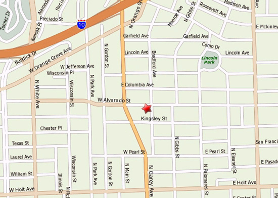 We are located on the eastern side of Los Angeles county, in Pomona, California. Coming east on Highway 10 from Los Angeles, exit on Garey Ave., turn right on to Garey, upon coming to the third stop light, turn left and at the first cross street, Bradford, we are on the southwest corner. Traveling west from San Bernadino on Highway 10, exit on Garey Ave., which will actually put you on Orange Grove Ave. Turn left on Orange Grove, and the second light you come to will be Garey, turn left and after the second light you come to, turn left and at the first cross street, Bradford, we are on the southwest corner. |