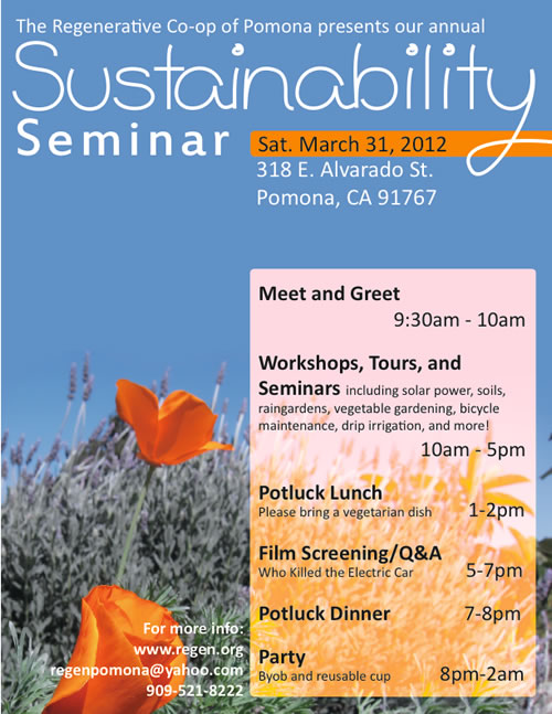 Sustainability Seminar 2012Join us for our annual Sustainability Seminar on Saturday, March 31, 2012! Workshops on gardening, composting, solar power, home energy efficiency and more! We will screen the film, "Who Killed the Electric Car," and have a discussion on the development of new electric and hybrid vehicles. We'll host a vegetarian potluck lunch at noon, and dinner and a closing party will happen after the evening forum. See you soon!!! Poster: